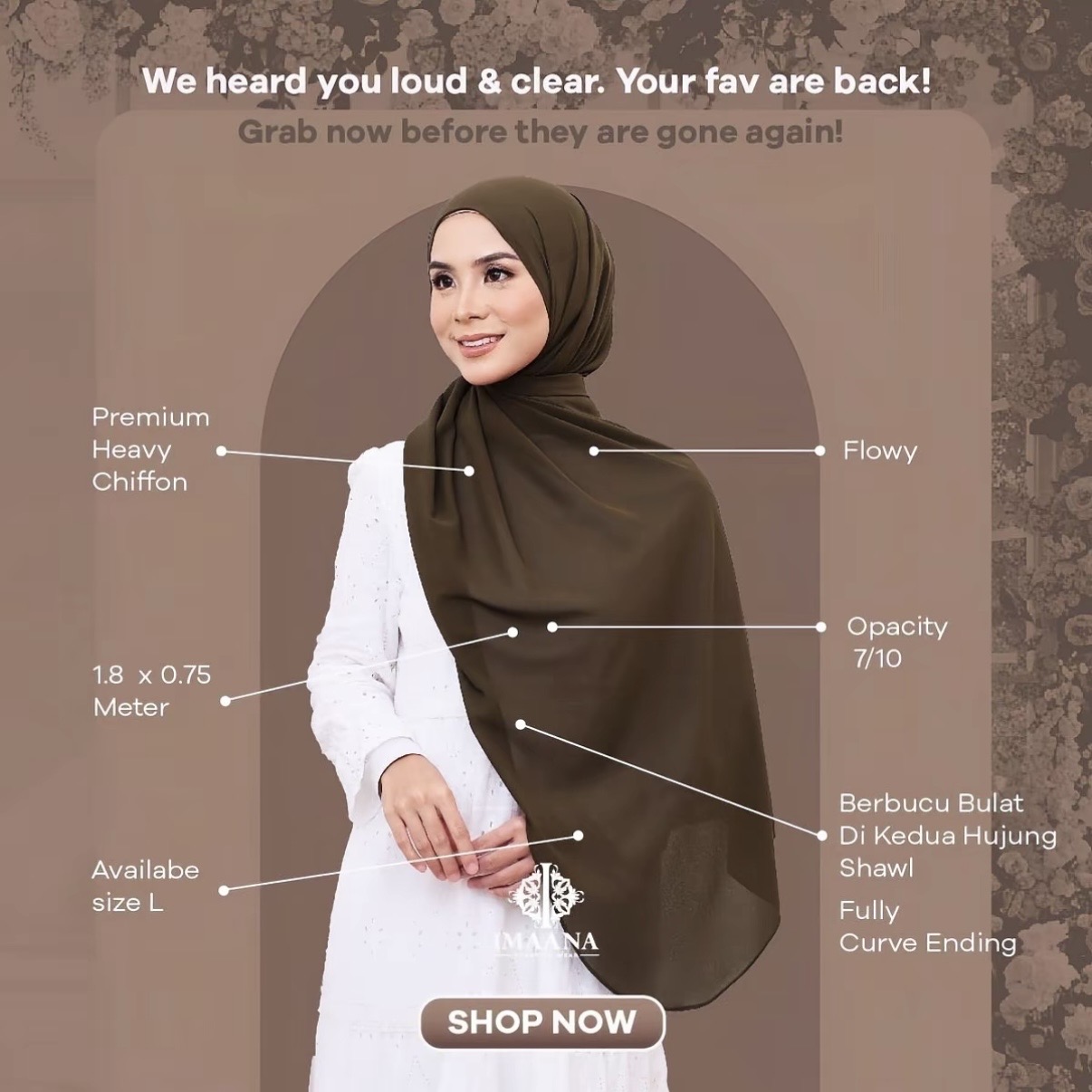 • Bahan HEAVY CHIFFON: IVANNA CURVE WIDESHAWL dibuat daripada bahan PREMIUM HEAVY CHIFFON.